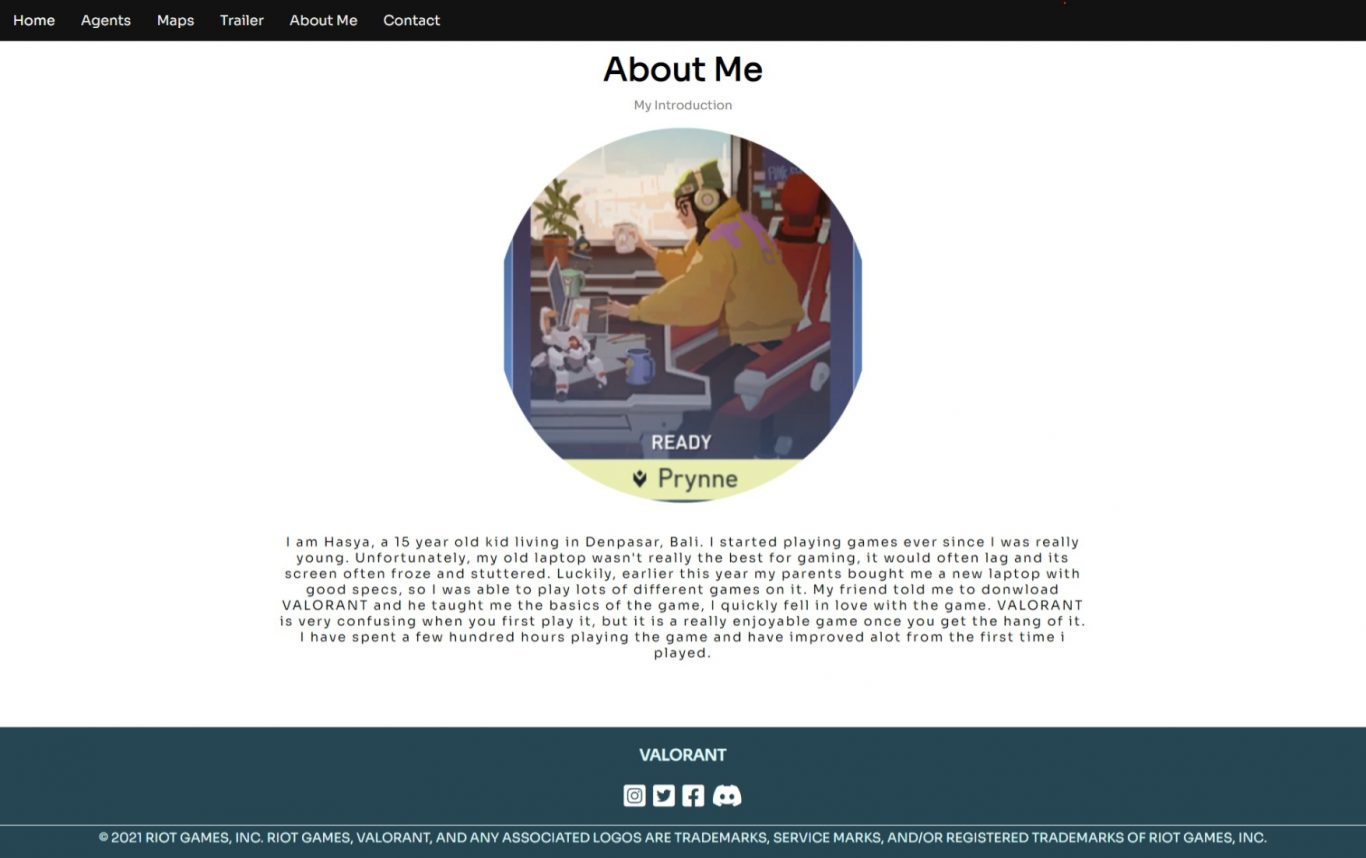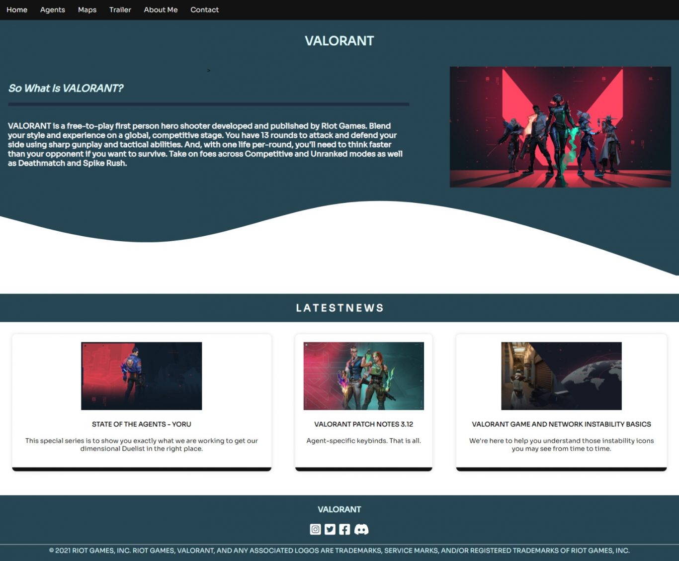 I really like playing games, especially Valorant. I created a website that contains information about valorant, the latest info, maps, valorant agents, video trailers.