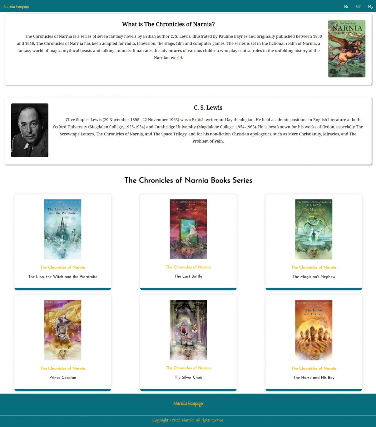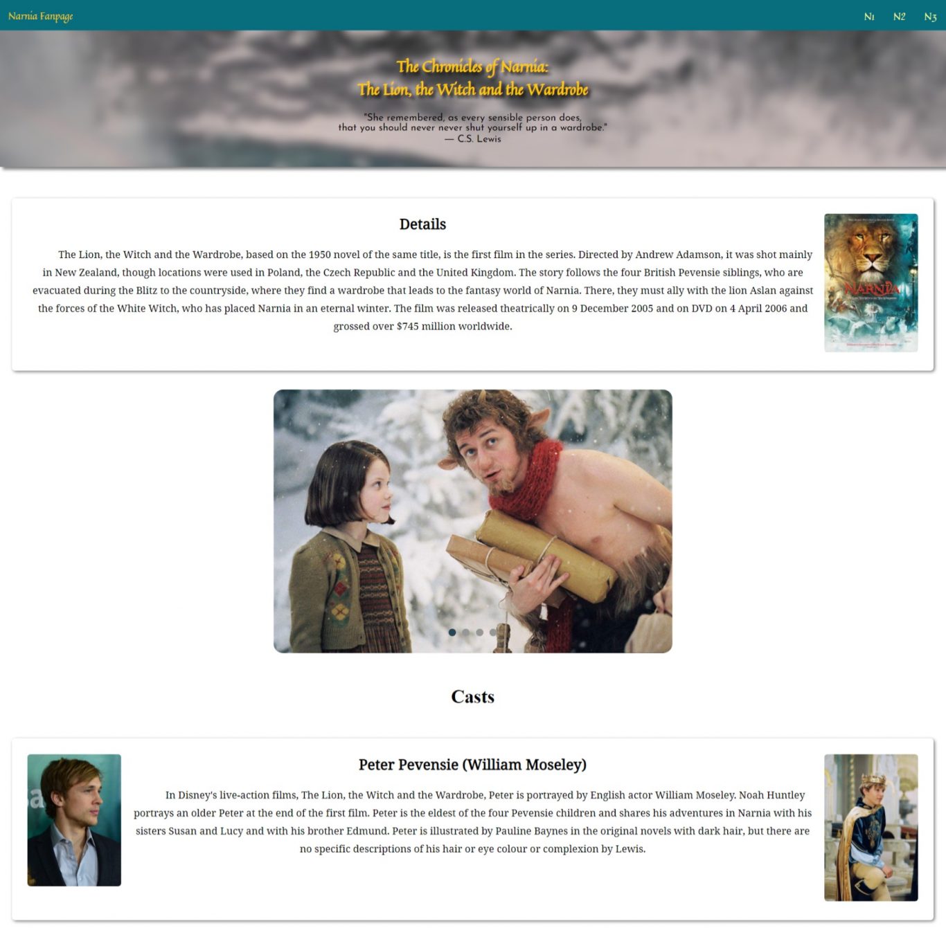 The website is a fan page of “The Chronicles of Narnia” movie. On this website, I give information about Narnia and also there are pages that contain more detailed information about each series.