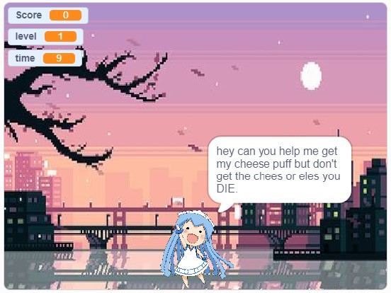 One day squid girl was eating her cheesy puff but the cheesy puff was taken by the chees. try to get it back but needs your help to do so, enjoy playing