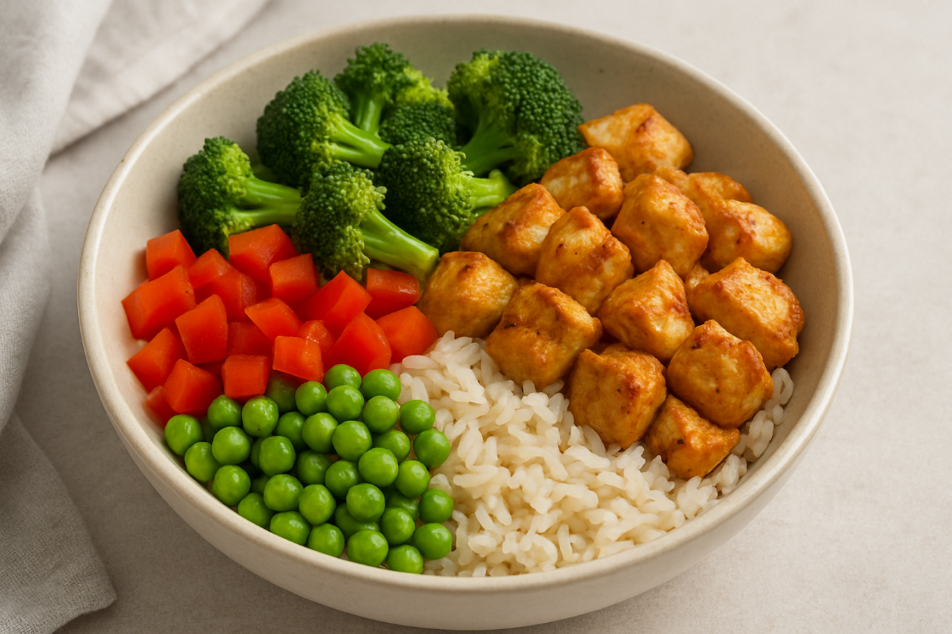 - Add rice to a bowl and arrange chicken and vegetables on top.