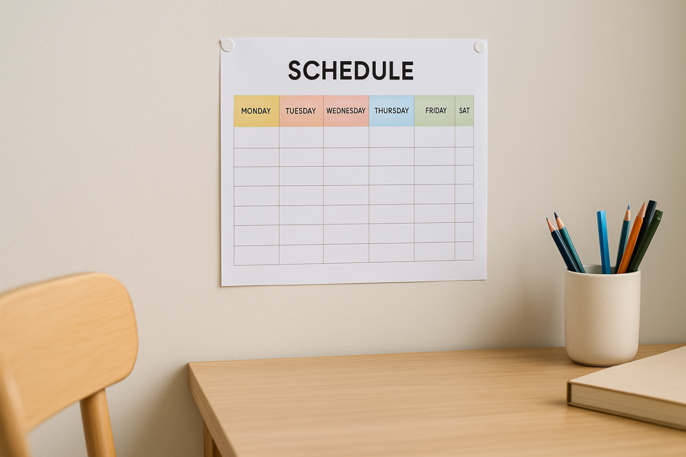 Help your child develop a routine by creating a visual schedule. Post it on the wall near their desk using colorful charts or illustrations. The schedule can include study time, breaks, meals, and creative activities.
