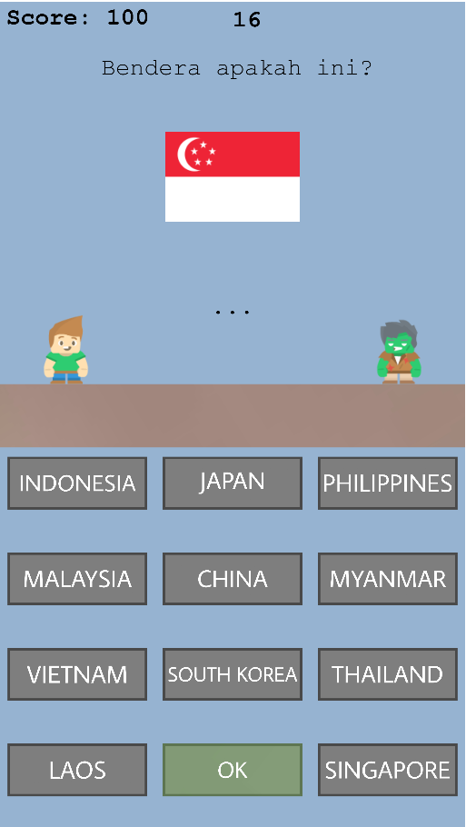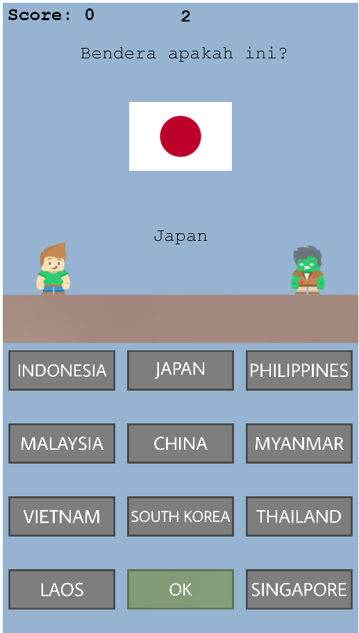 Game tebak-tebakan bendera dunia. Jika bisa menjawab pertanyaan dengan benar, maka player menyerang musuh dan mendapat score. Jika salah, enemy akan membunuhmu.
