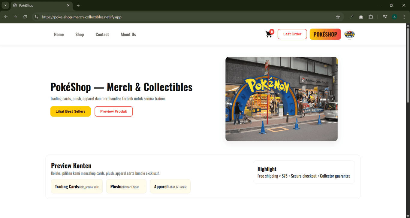 Pokeshop E-Commerce adalah online shop khusus trading cards, plush, apparel dan merchandise yang berkaitan dengan pokemon. Fiturnya ada list produk, checkout produk, history order dan contact form.