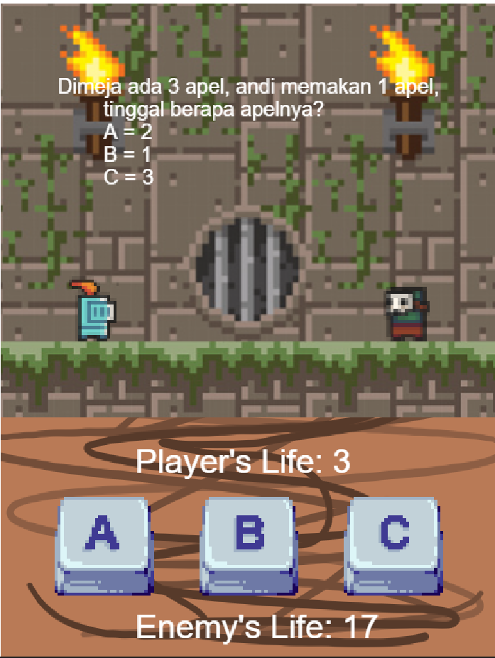 Quiz game with choices as the answer. There are 3 lives for players and 20 lives for enemies. Win the game by answering the questions correctly so that the enemy’s life runs out.